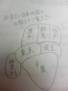 一昨日ポンさん・まき・純ちゃんが泊まりに来て、昨日はカラオケ大会しました! 久々メンバーでした!やっぱ高校時代のメンツっていいもんですよね! ちなみにカラオケでは1番最初にヘ●リアソングを歌いました(私は歌えませんが)。まさかのアニメ映像出現でまきが携帯片手に画面に食い付く展開。(撮るのかよ…!!) で、そう。 件名の「日本地図」。 描かされたんです。 とりあえず、関東。(それ以外は自主的に描きませんでした) なんていうか、 笑えない酷さ? 中1くらいのときはさ、覚えてたんだよ県庁所在地までしっかり。 でも全部忘れてたんだよ興味なかったから← だから中国地方の県言ってみろとか言われて「京都」とか答えるんだよ(京都人様ごめんなさい)。 そんな凛の描いた関東地方、 本 日 公 開 。(何) 少なくとも東京の位置はあってると思ってた。
