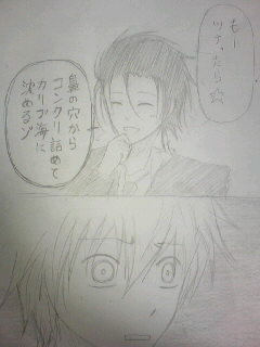 なんかこないだ携帯のファイル整理してたら色んなもん発掘しました。9割ゆりなちゃんに送りつけた絵だけど。あ、ゆりなちゃーん、またメール止まってるよー(笑) あと手紙もうちょい待ってて!山ヒバ漫画あと1、5ページ!(微妙) というわけでファイルに眠ってた米と英(ヘ〇リア)を添付してみました。米って物食べてるときうっさいですよね! あ、でも本命は別人です(笑) ・私信 昨日、メールありがとうございました!後でまたちゃんとしたレスはするつもりですが、お礼だけでもすぐに言いたくて…とても励みになりました。前向きに頑張ってみます(^^) |